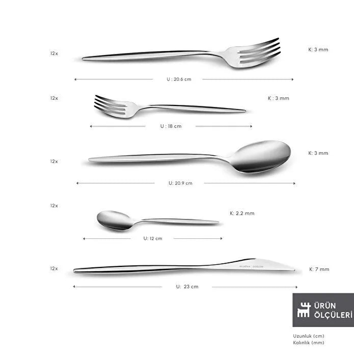 Bu set, her öğün için gerekli çatal, kaşık ve bıçak parçalarını kapsar: